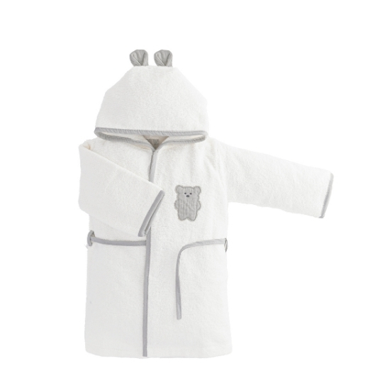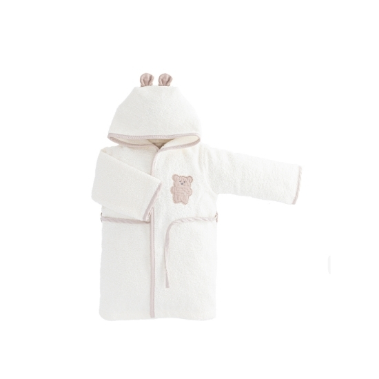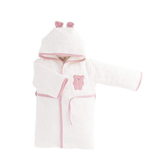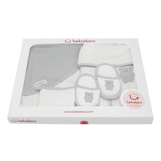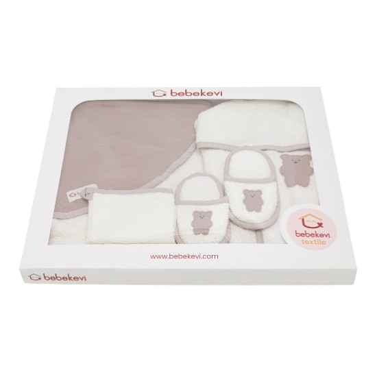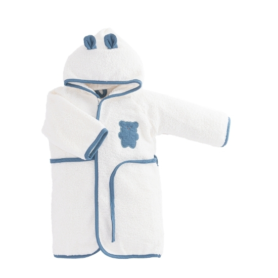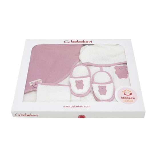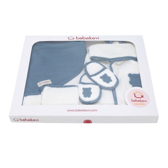 5 pcs. muslin bathrobe set made from 100% cotton, OEKO-TEX® certified, featuring a dual-sided bathrobe (towel fabric on one side, muslin on the other). The set includes essential bath items for daily baby care: towel, bathrobe, bath mitt, and slippers.
