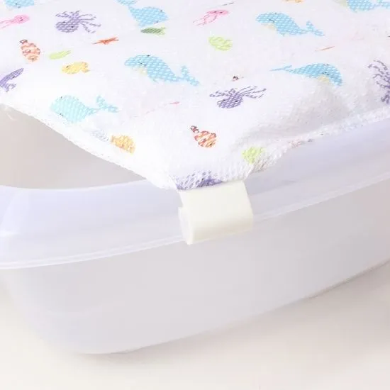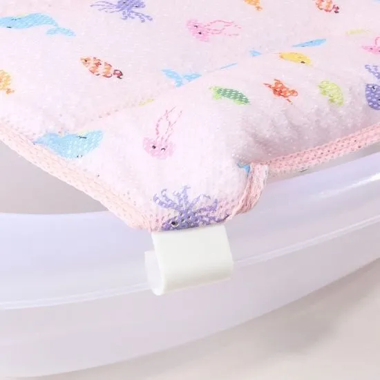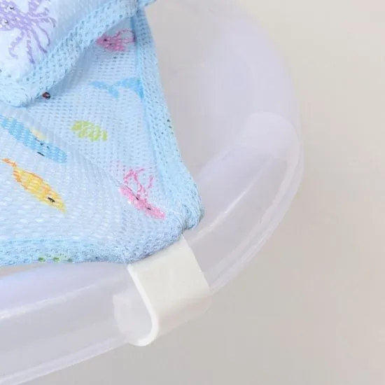 A supportive bath net filled with soft foam beads that adapt to the baby’s body. Features six strong plastic holders for safe and stable use.
