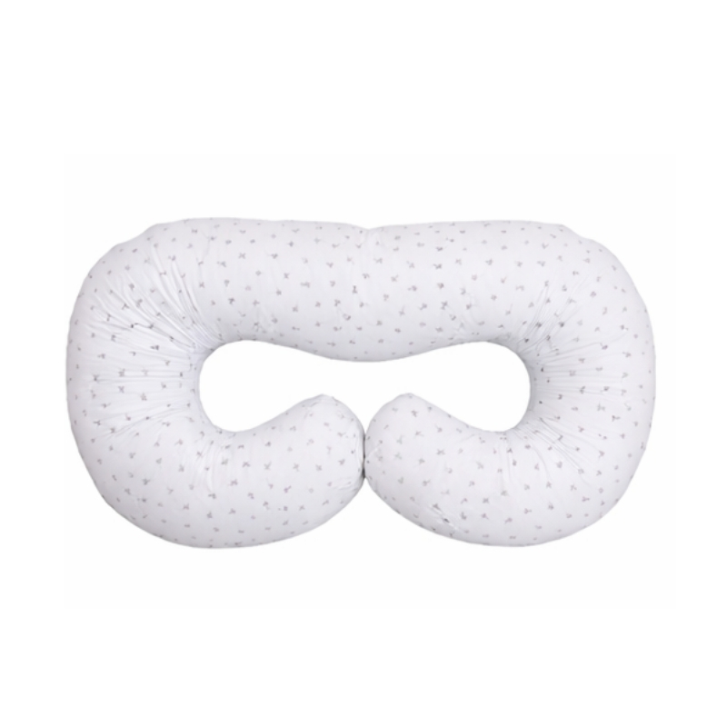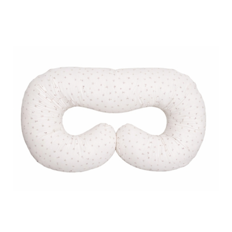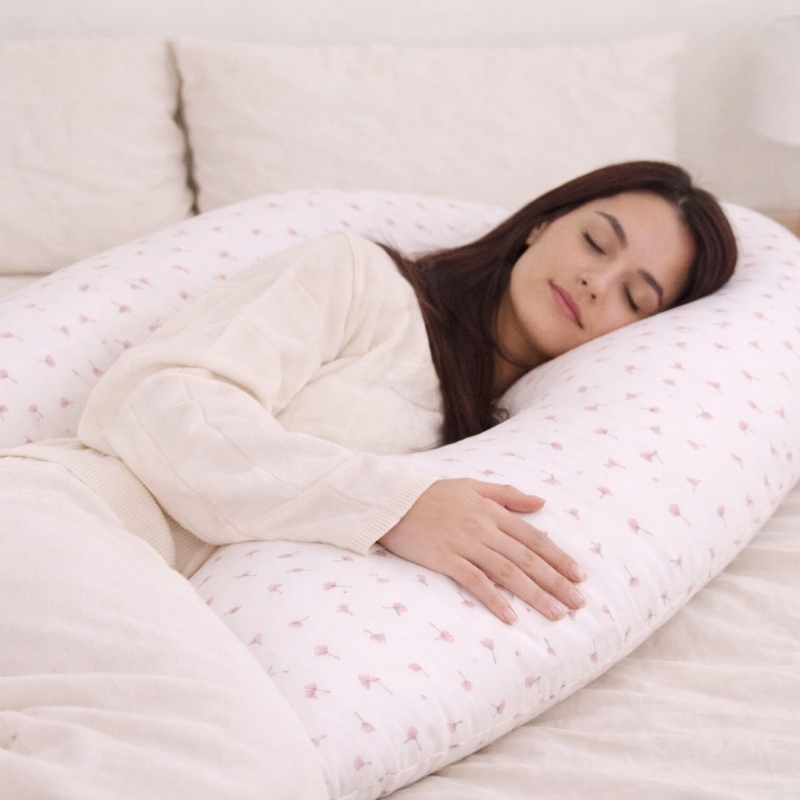 A giant full-body pregnancy pillow made from 100% cotton poplin. Its ergonomic shape supports the belly, back, and legs, allowing pregnant women to hug it, rest their legs on it, or position it any way they need for comfortable sleep.