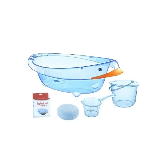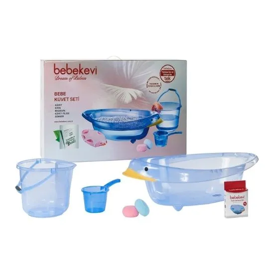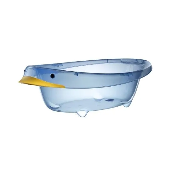 A 5-piece transparent baby bathtub set with a cute duck-shaped design. Durable, non-foldable structure with practical accessories for daily bathing.