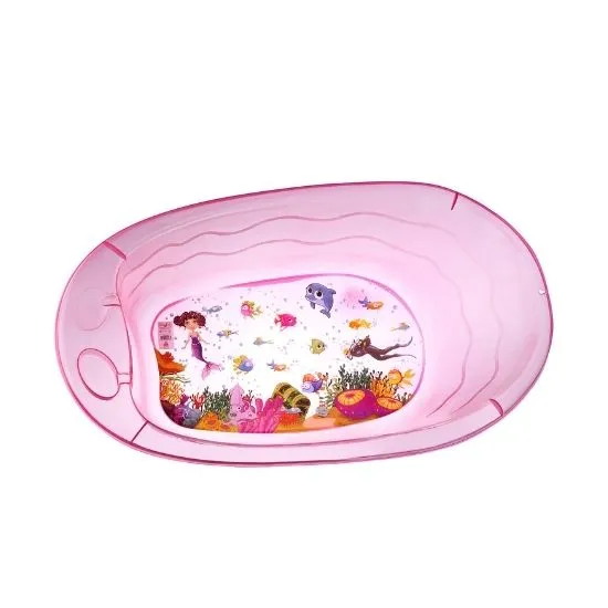 A clear plastic baby bathtub featuring a cute printed pattern. Durable, practical, and easy to clean.